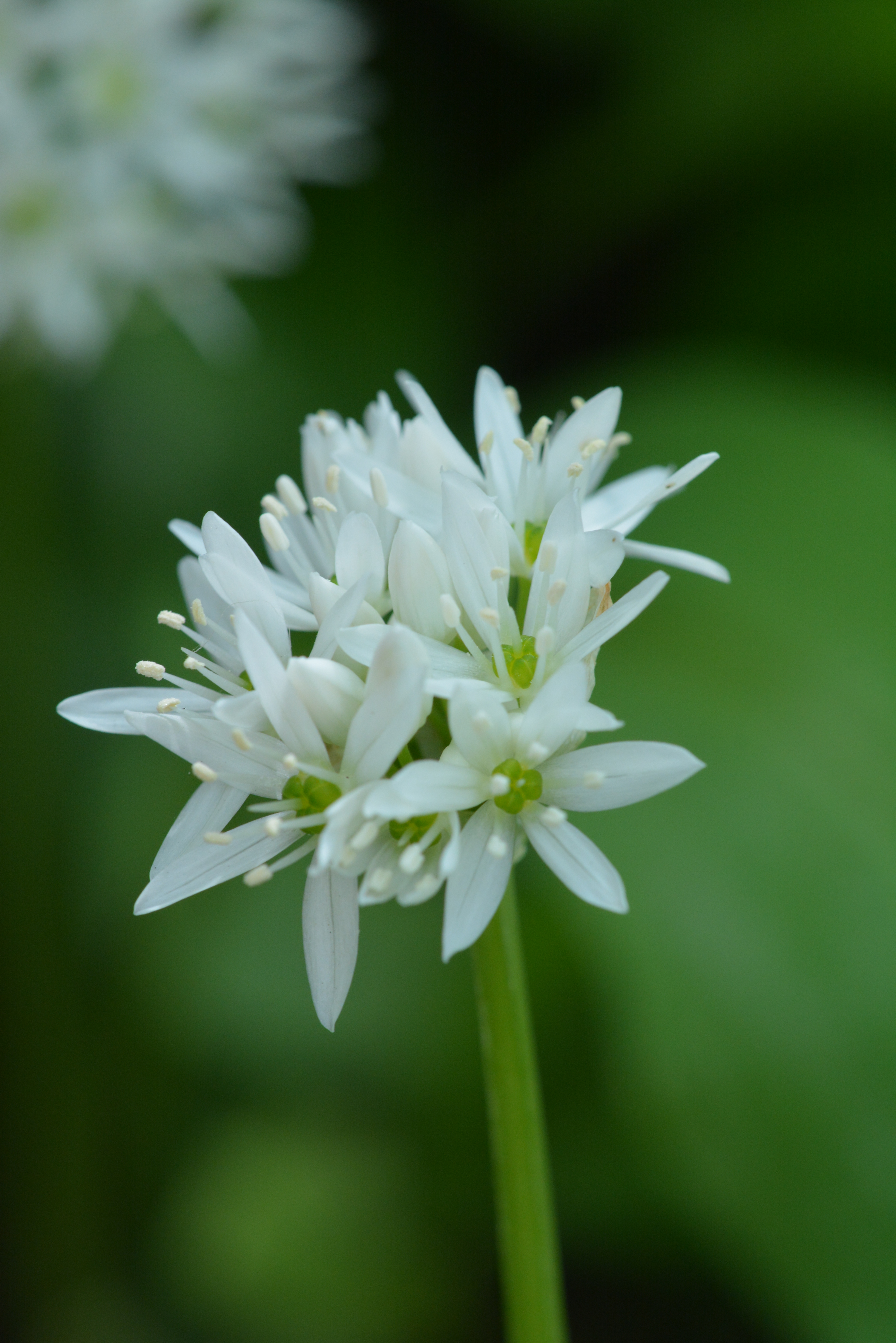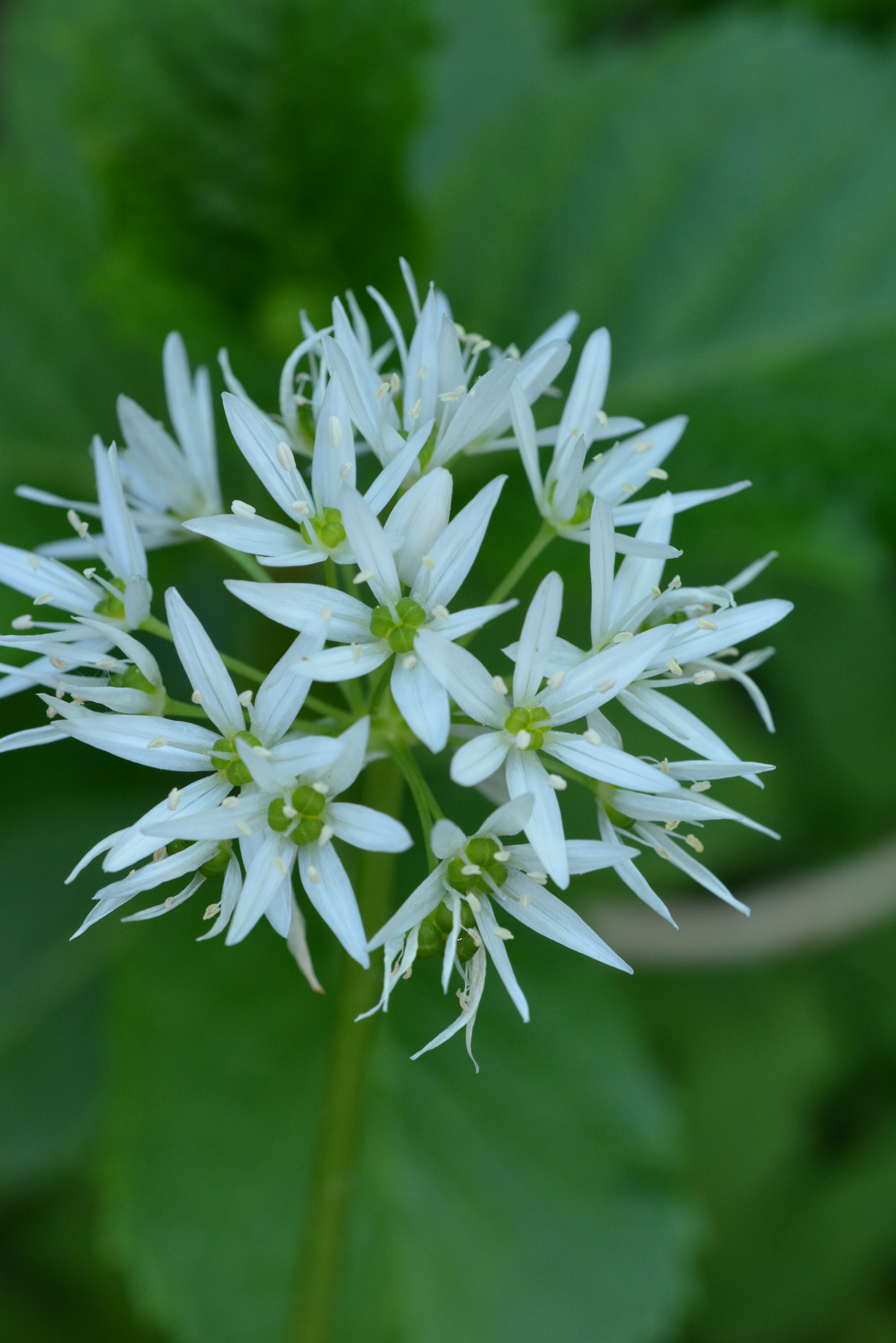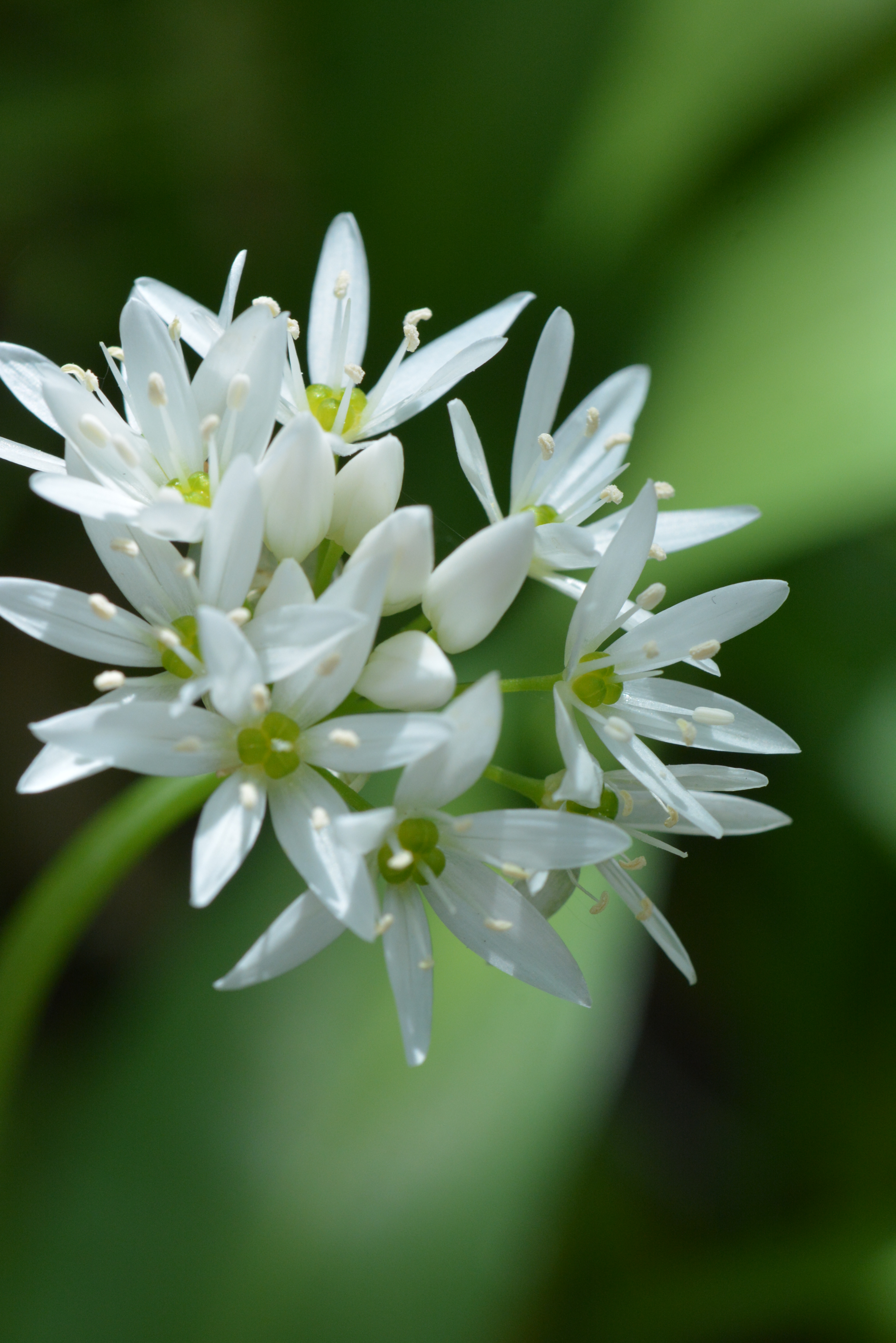 Botanik: Der Bärlauch gehört zu den Liliengewächsen. Er wächst vorzugsweise in schattig feuchten Buchenwäldern. Der 5-15 cm lange Blattstiel entspringt direkt aus der Zwiebel. Die oberseits glatten dunkelgrünen Blätter sind eiförmig bis lanzettlich geformt und bis 5 cm breit. Sie duften beim Zerreiben kräftig nach Knoblauch. Die Blüte des Bärlauchs duftet nach Honignektar und ist eine weiße Sternenblüte, die auf einem blattlosen bis 15 cm hohen Stengel thront.