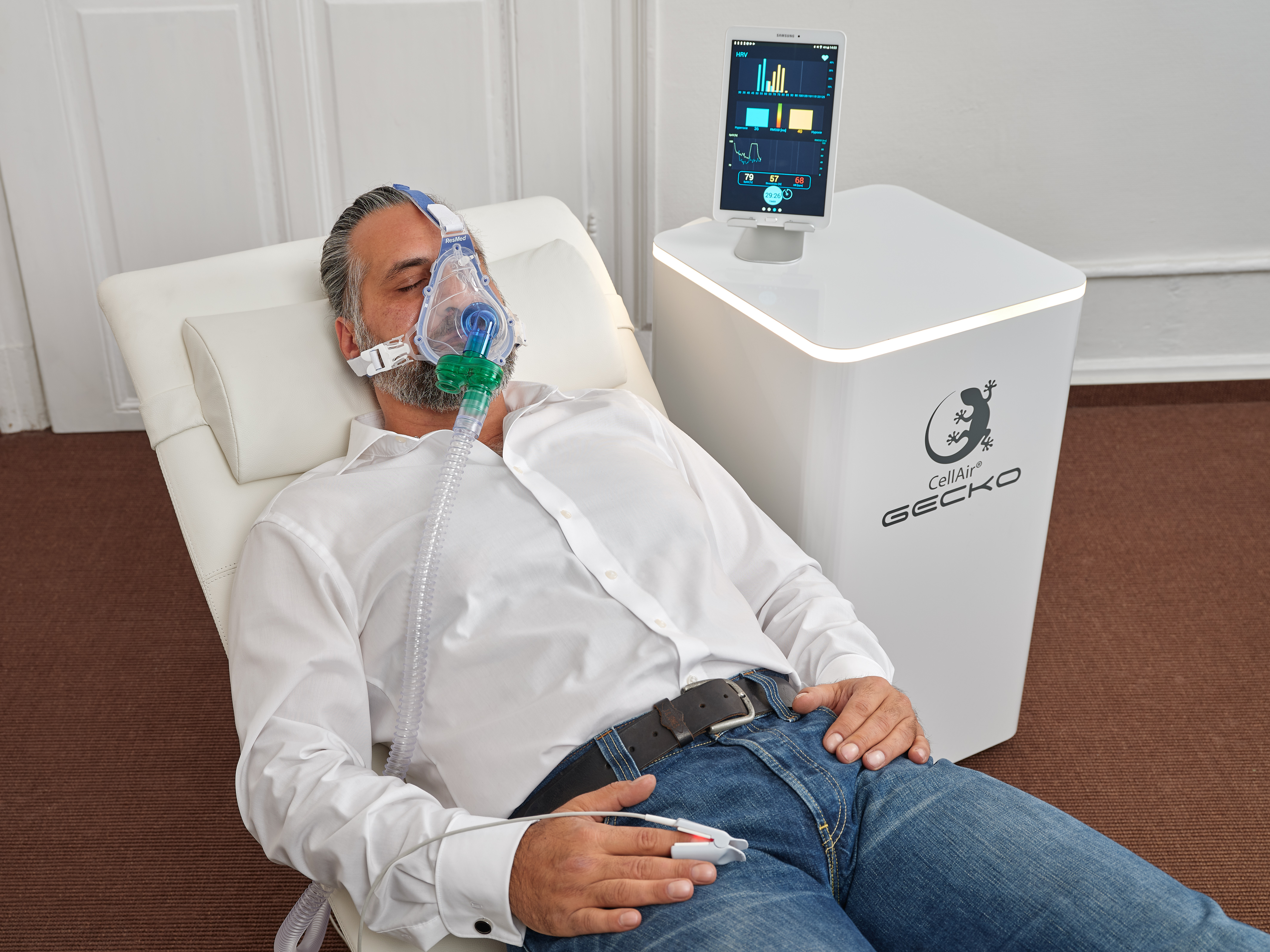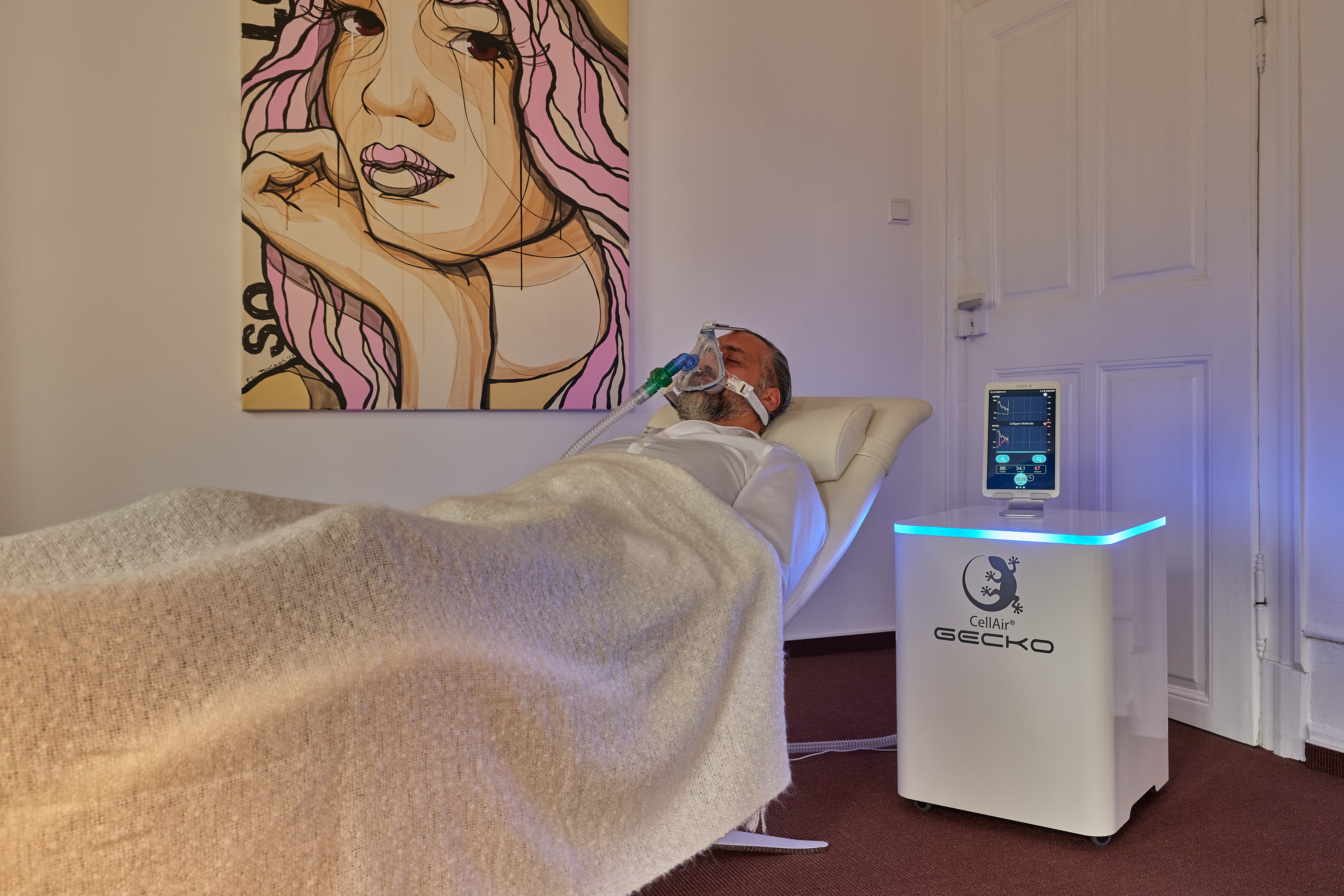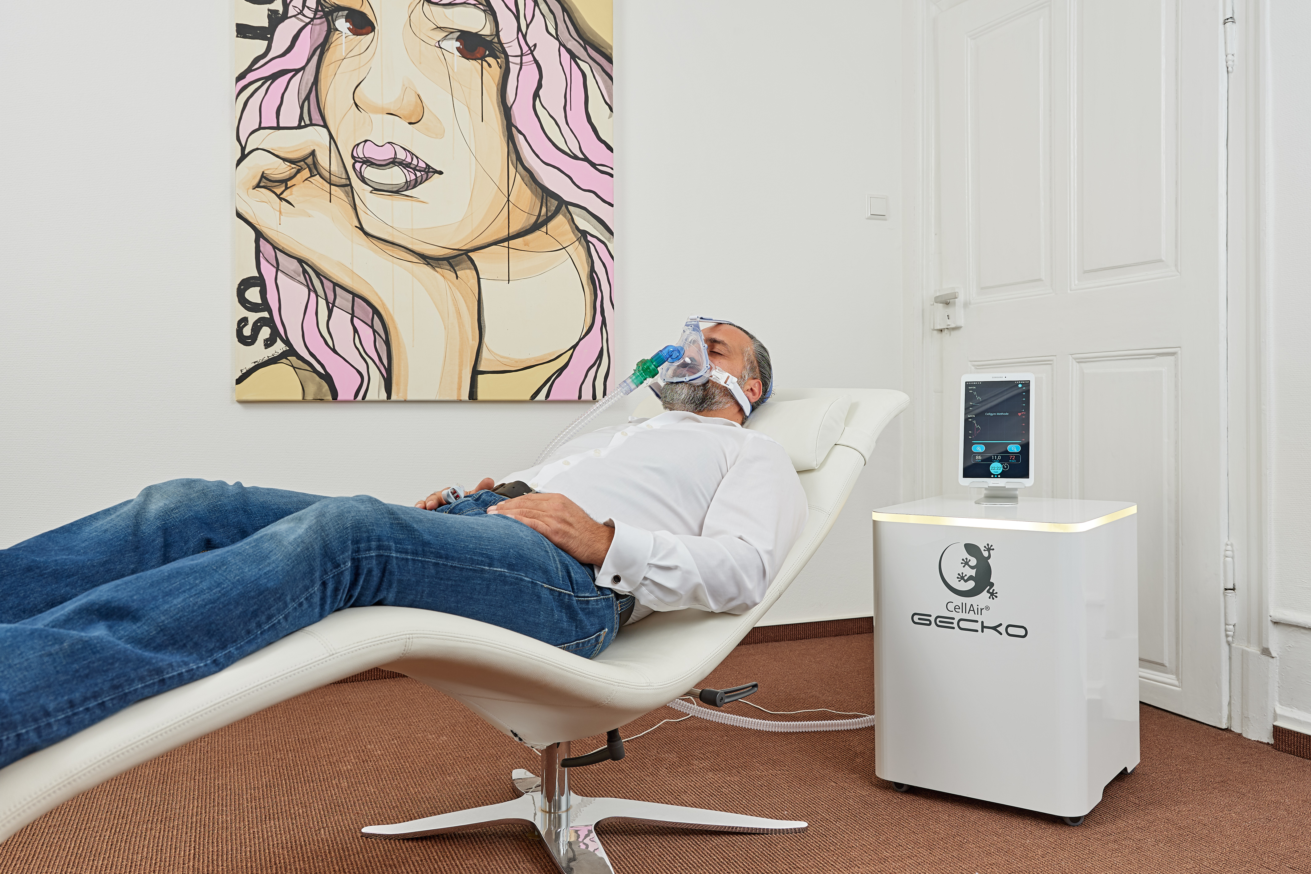 Das Zelltraining erfolgt ganz entspannt im Liegen. Über eine Atemmaske wird jeweils für wenige Minuten eine individuelle Sauerstoffmischung, d.h. sauerstoffarme Luft im Wechsel mit sauerstoffreicher Luft eingeatmet. Durch diesen Wechsel werden erschöpfte, „alte“ Mitochondrien zerstört und die Vermehrung gesunder physiologisch „jüngerer“ Mitochondrien angeregt.