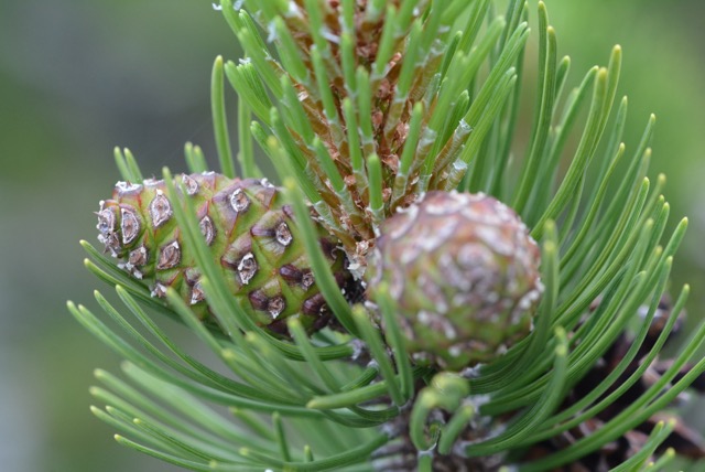 Sie wächst langsam und misst nach 10 Jahren gerade einmal 10 cm. Ihre Nadeln können bis zu 12 Jahre (!) am Baum bleiben. Sie sind dreikantig, in Büscheln zu je fünf Nadeln angeordnet – im Unterschied zur Kiefer, Pinus silvestris, bei der die Nadeln paarweise stehen. Zirbennadeln sind bläulich grün gefärbt, mit stumpfer Spitze. Die erste Blüte entsteht nach 40-50 Jahren. Sie wird auch nur alle 6-8 Jahre blühen, im Zeitraum zwischen Mai und Juli. Die Samenreifung dauert 3 Jahre. Die Zapfentriebe verfärben sich erst nach gut einem Jahr hellbraun und fallen zu Beginn des dritten Jahres ab. Da die Zirbennüsse zu schwer sind, um sich durch den Wind verbreiten zu lassen, hat die Zirbe einen verlässlichen Partner, den Tannenhäher. Zirbennüsse sind seine Leibspeise und so legt er im Spätsommer Vorratsdepots an, für die er besondere Stellen auswählt: nicht zu schneereich, nicht zu windexponiert, kein zu starker Bodenfrost bei lockerem Untergrund – genau die Stellen, an denen die Zirben optimale Wuchsbedingungen haben.